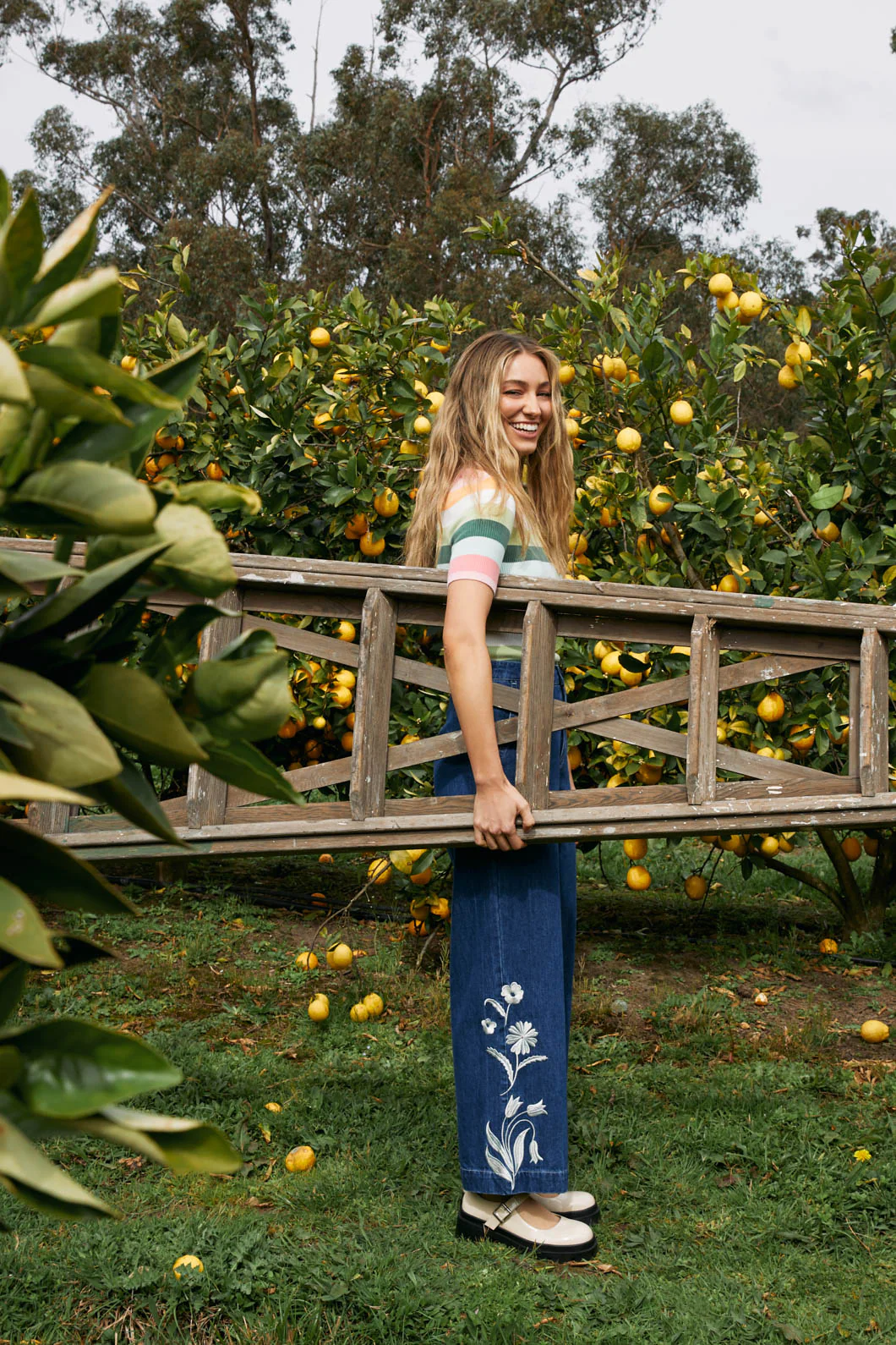 Blue denim straight leg, high waisted jean. Featuring embroidery detail on the sides and handy front pockets