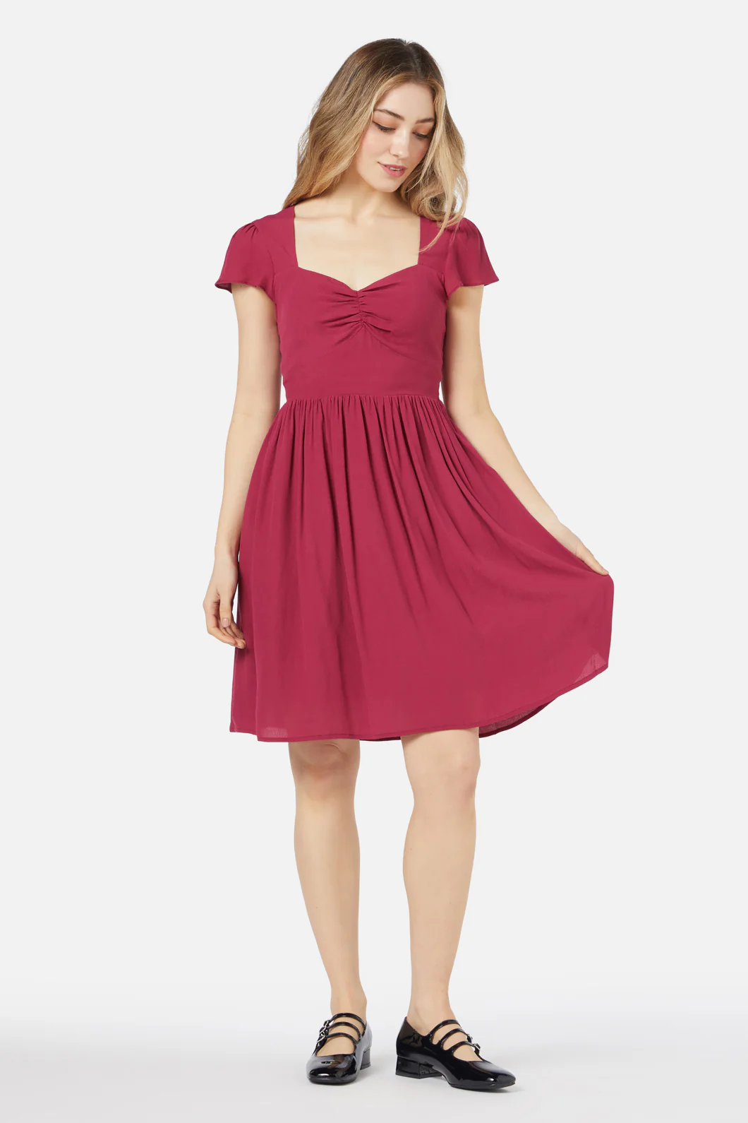 Berry red romantic mini dress, a flattering style with a sweetheart neckline, cut out back detail & gathered skirt