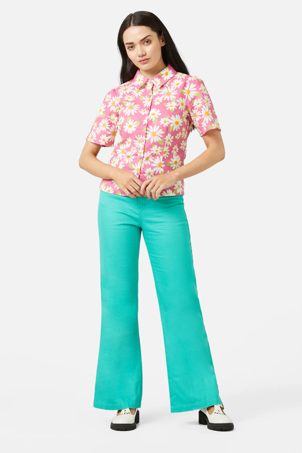 point collar, short sleeve blouse in raspberry and butterfly print- fall in love with our fresh wild daisy print, in a perfect zingy summer palette
